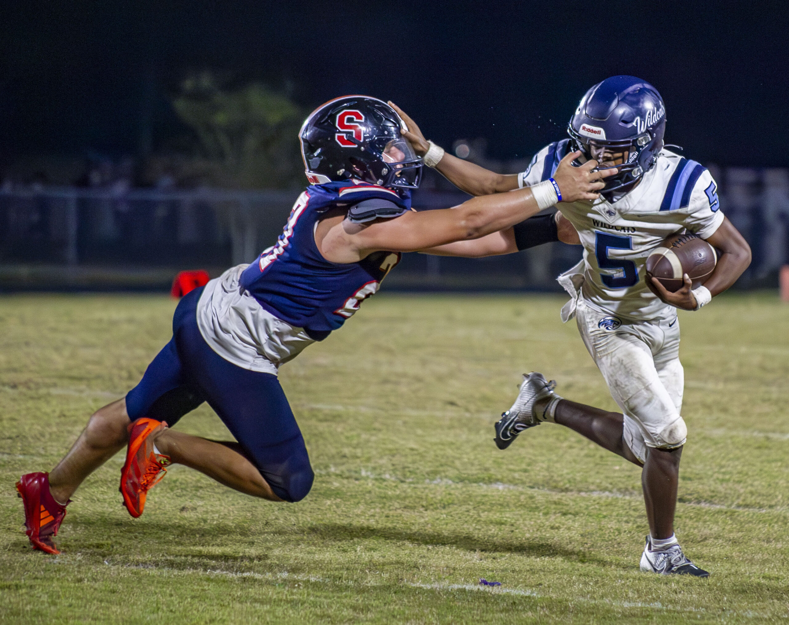 Springstead’s safety, Dalton Williams, grabs Wildcat’s Tavion Cousin’s face mask. (Photo by Hanna Maglio)