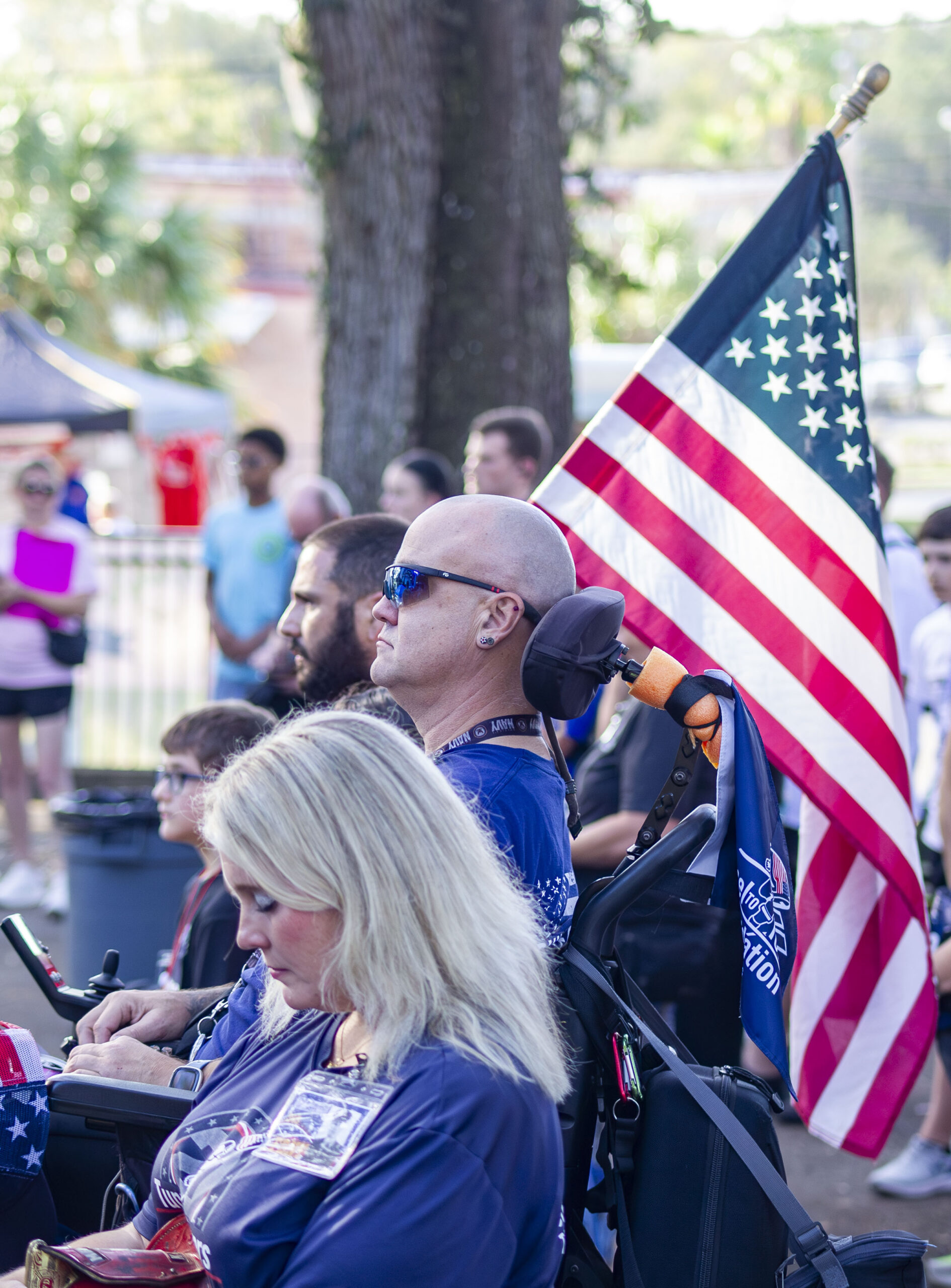 Jerry Wayne Padgett II and Jenny Williams listen to the Tunnel to Towers 5K opening ceremony in Brooksville, Fla., on Saturday, November 9, 2024. (Photo by Hanna Maglio)