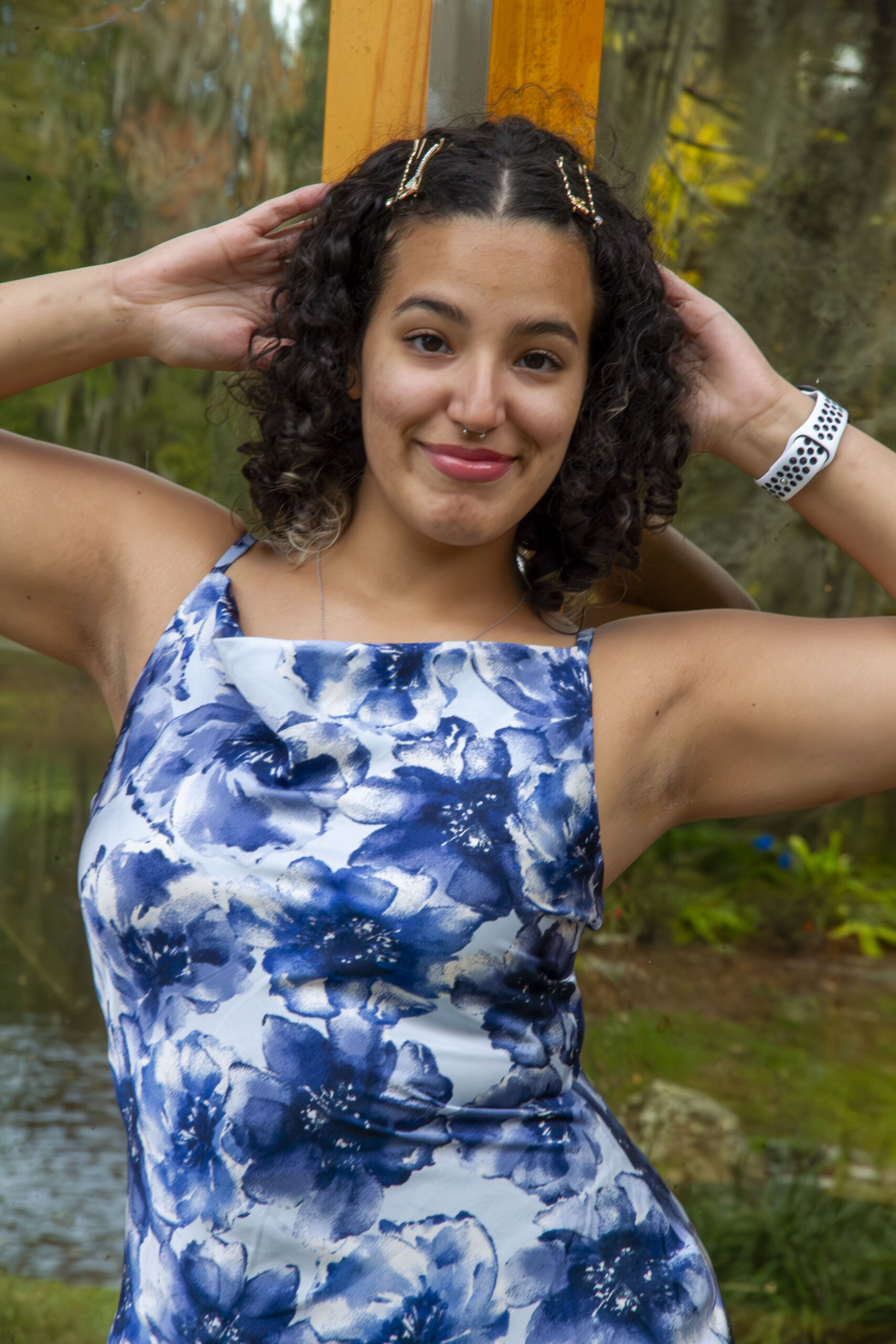 Julie Maglio pulls back her hair while sitting on a car outside of The Ice Cream Barr in Brooksville, Fla., on Saturday, February 23, 2025. (Photo by Hanna Maglio)