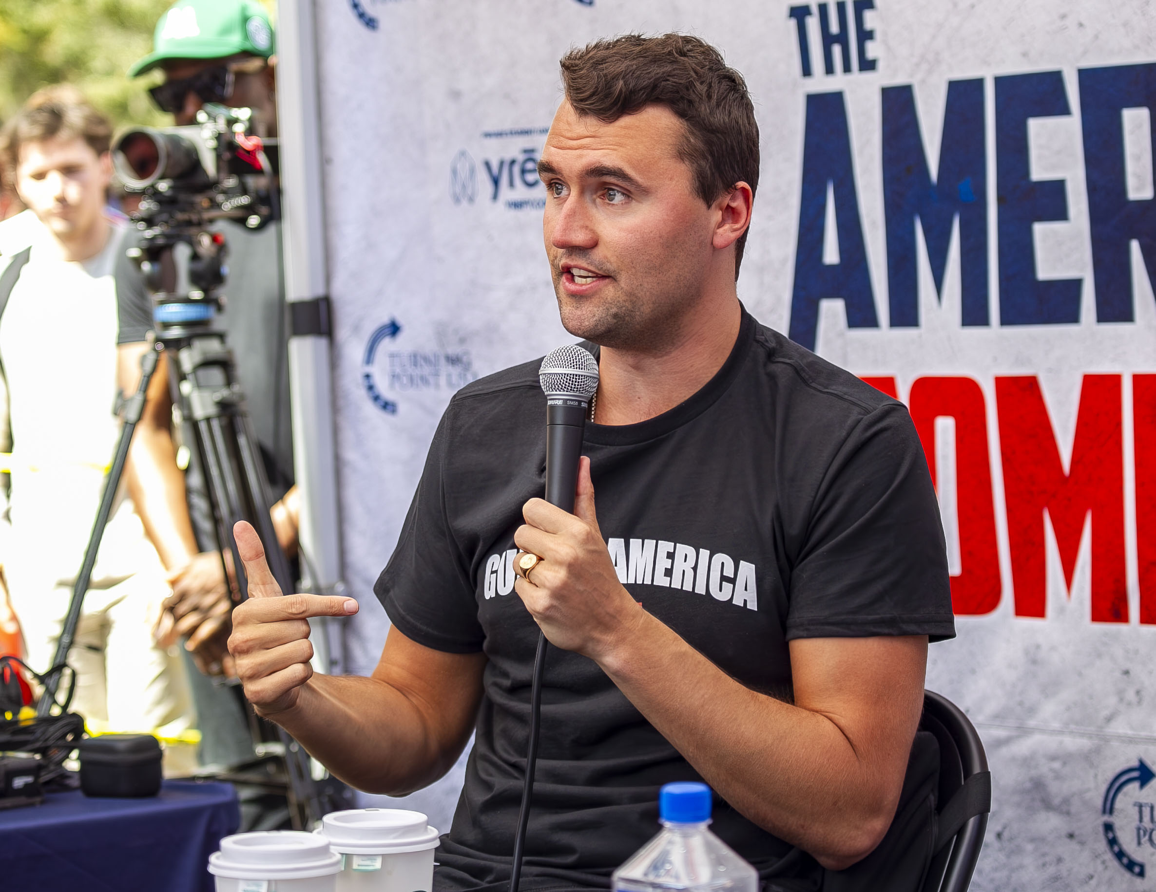 Charlie Kirk speaks to spectators while tabling at the Plaza of the Americas on the University of Florida campus in Gainesville, Fla., on Thursday, February 27, 2025. (Hanna Maglio/WUFT)