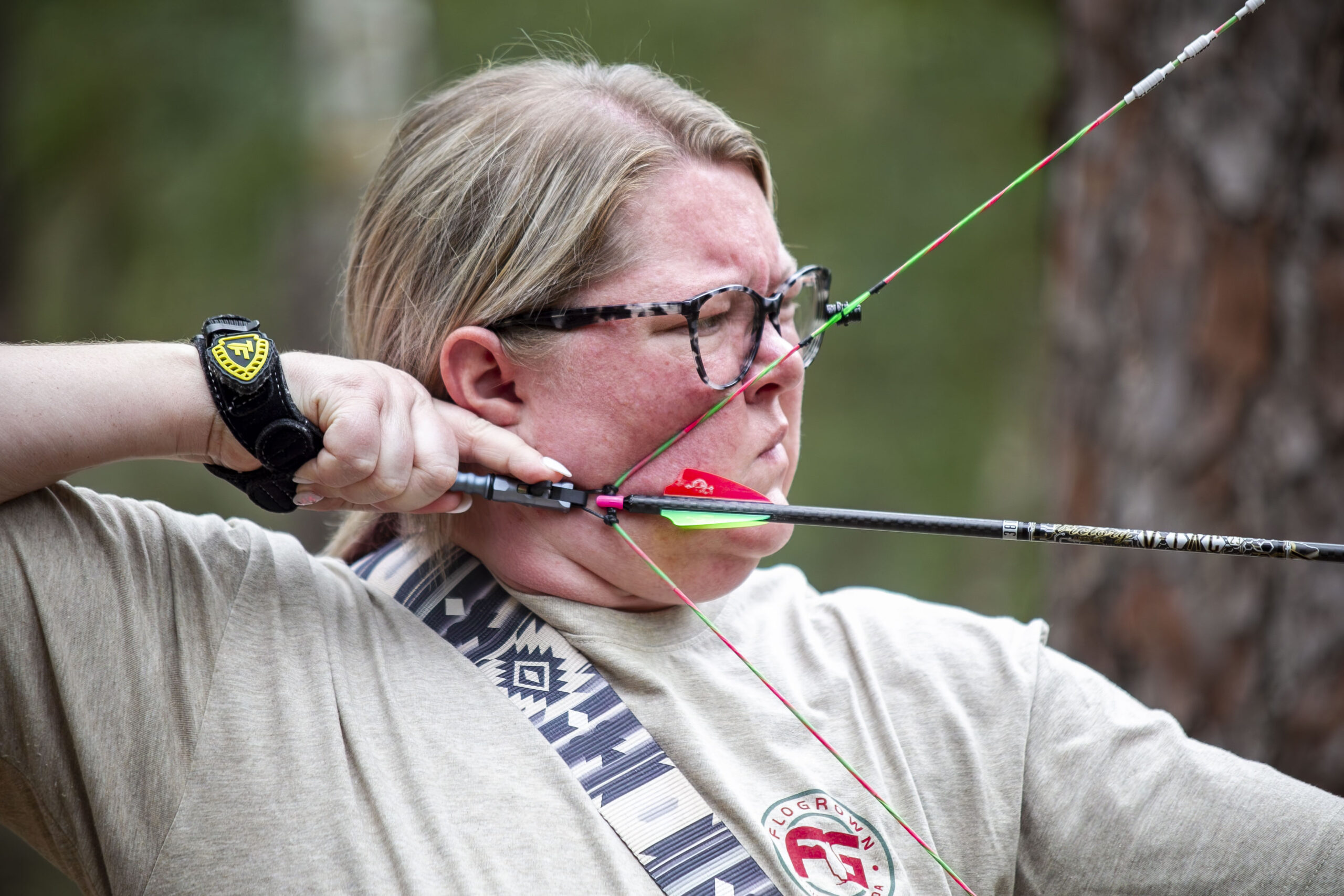Carey Wessel pulls back bow string during monthly 3D archery shoot at Chinsegut Conservation Center in Hernando County, Fla., on Saturday, February 1, 2025. (Photo by Hanna Maglio)
