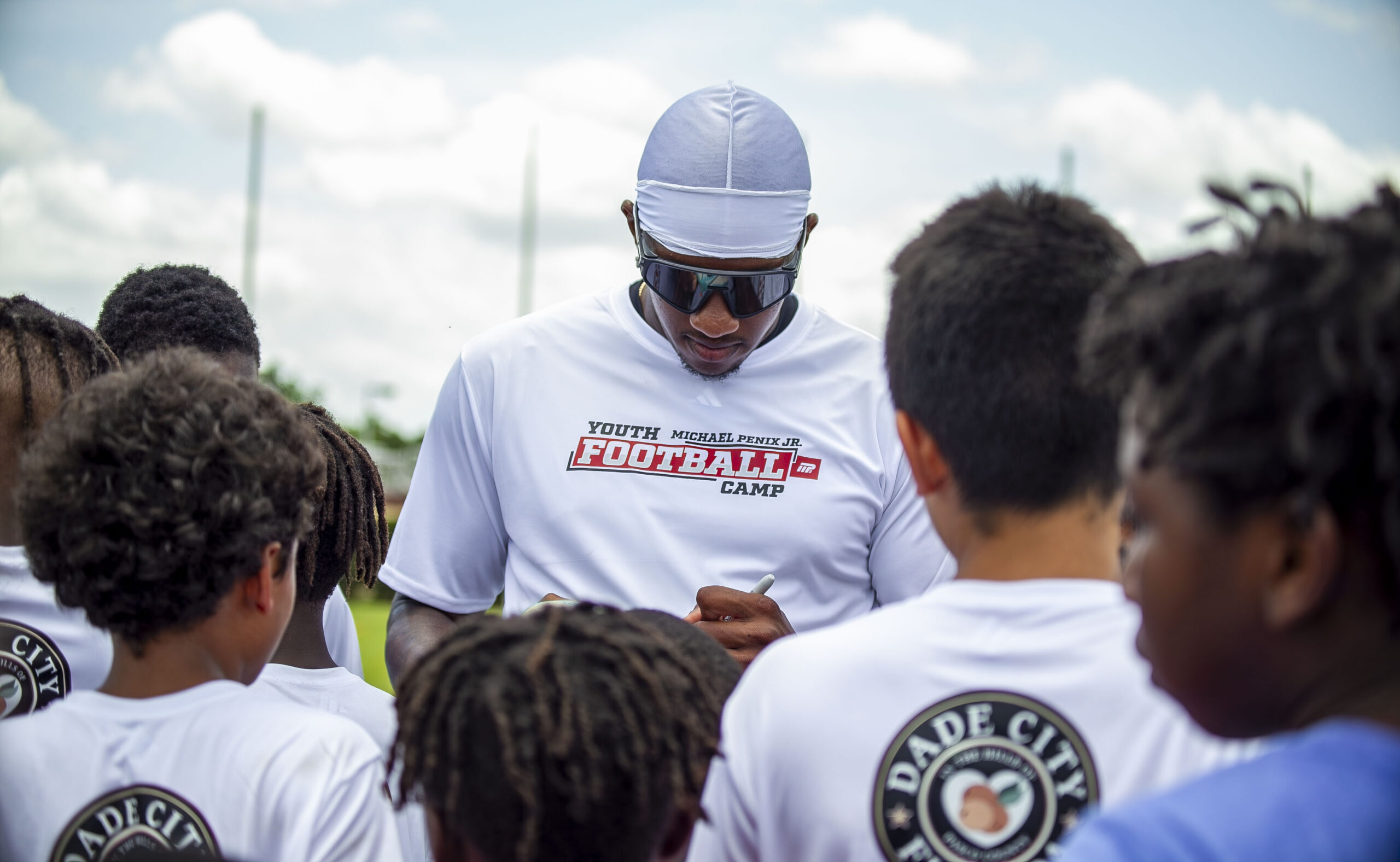 NFL quarterback Michael Penix Jr. speaks to a group of young athletes during his football camp at Mickens Field in Dade City, Fla. on Sunday, June 29, 2025. (Photo by Hanna Maglio)