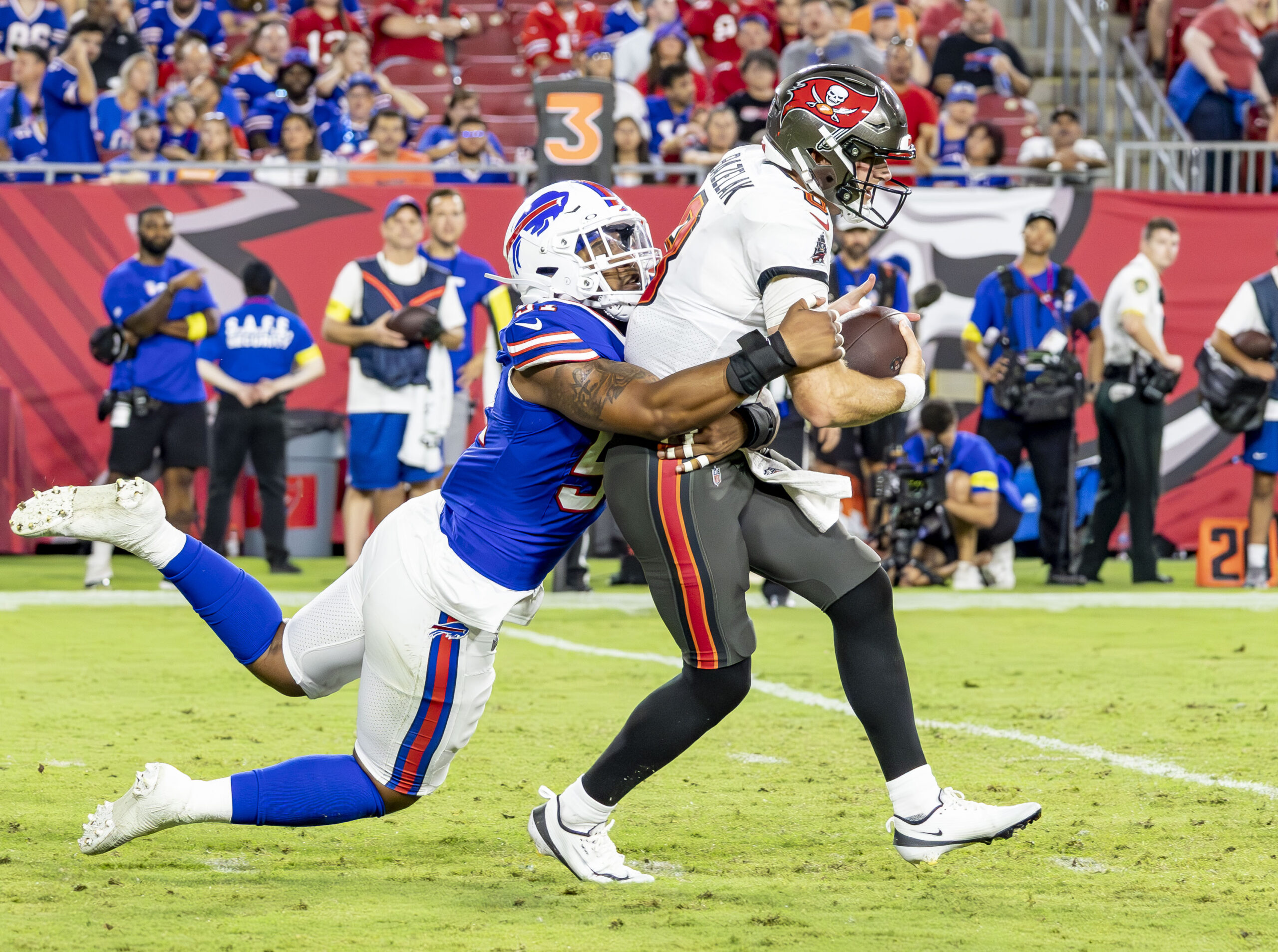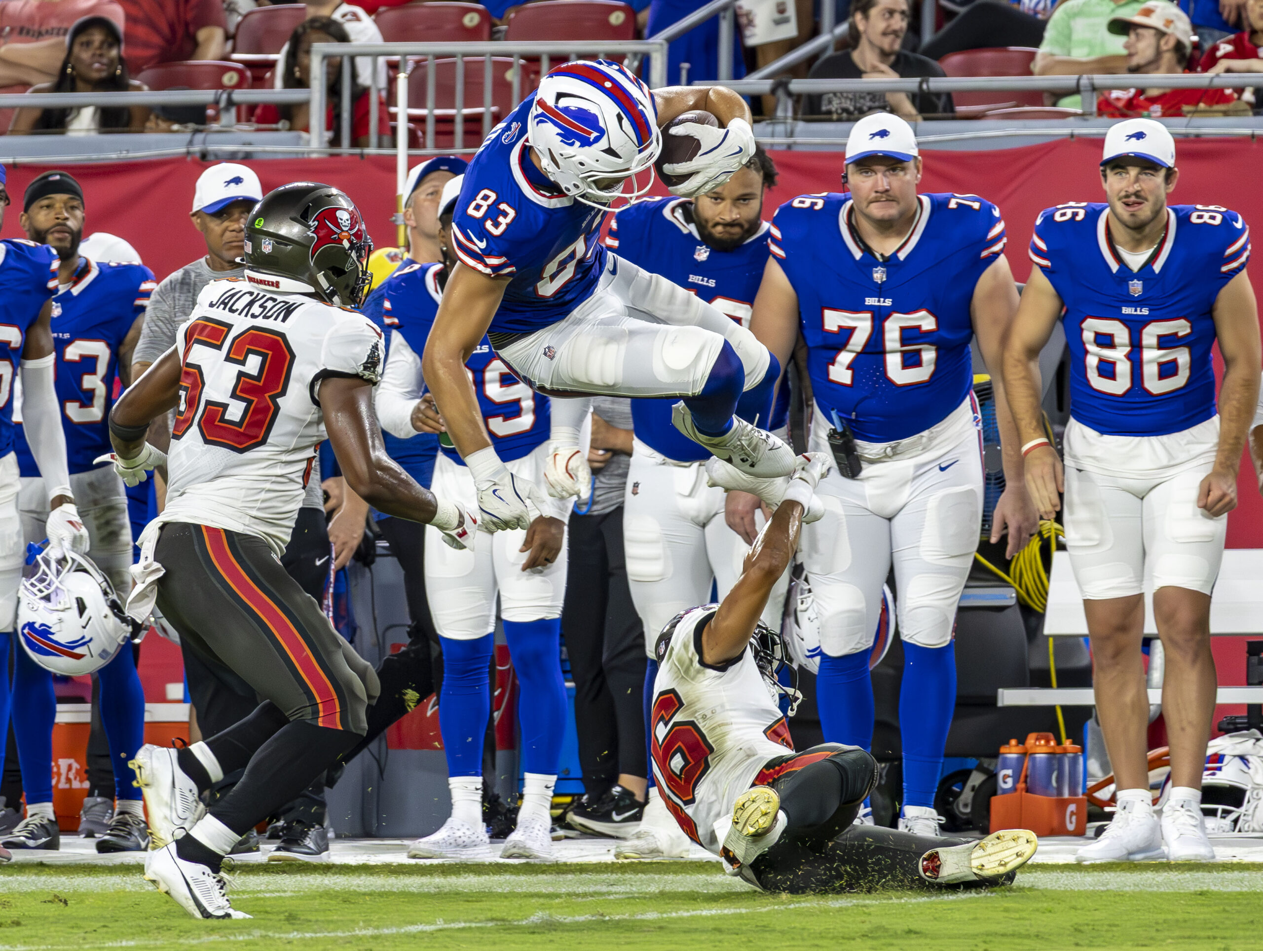 Keleki Latu, 83, jumps over Teddy Bridgewater, 16, during a game at Raymond James Stadium in Tampa, Fla., on Saturday, August 23, 2025. (Photo by Hanna Maglio)