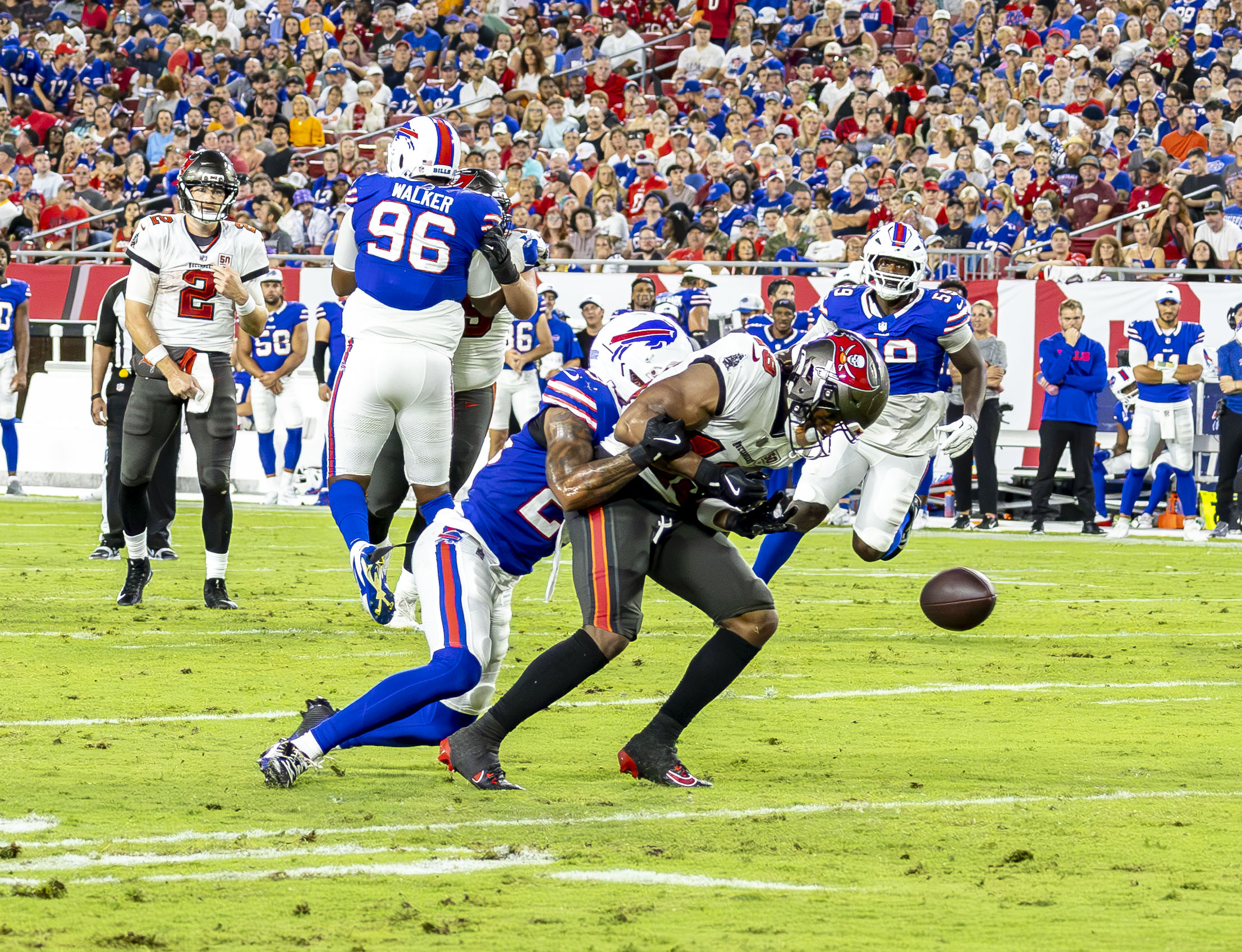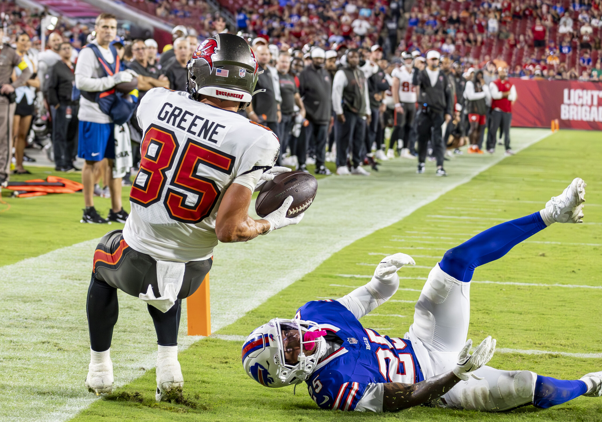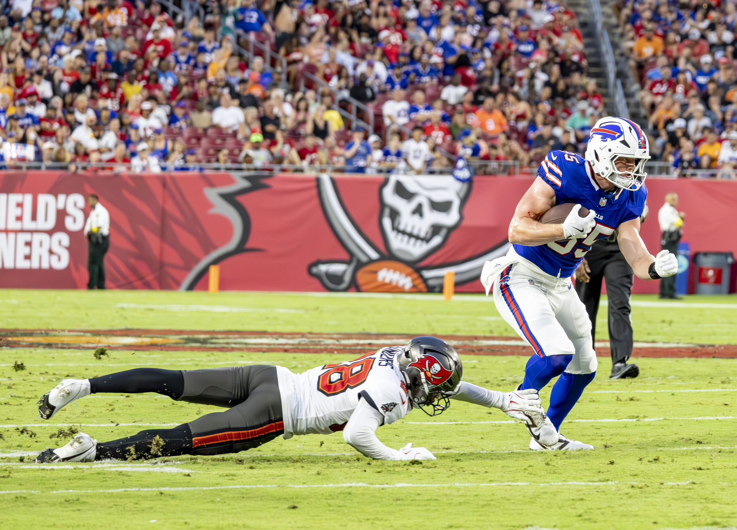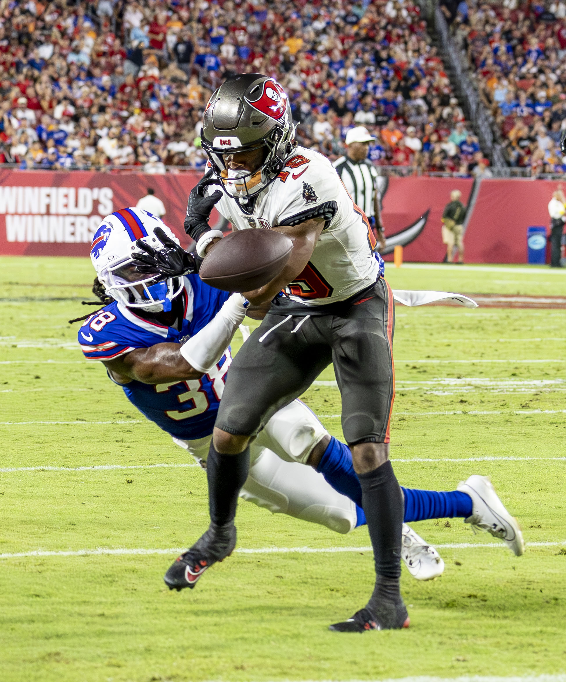 Shilo Sanders, 28, (left) tries to stop Jackson Hawes, 85, (right) during a game at Raymond James Stadium in Tampa, Fla., on Saturday, August 23, 2025. (Photo by Hanna Maglio)