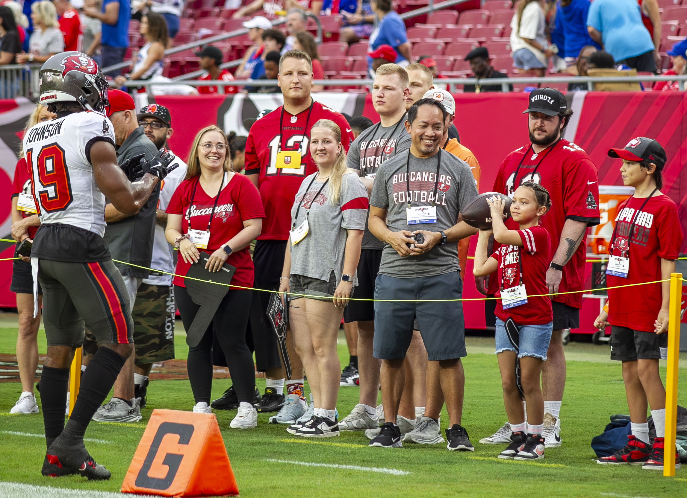 Baker Mayfield, 6, fist bumps a fan before a game at Raymond James Stadium in Tampa, Fla., on Saturday, August 23, 2025. (Photo by Hanna Maglio)