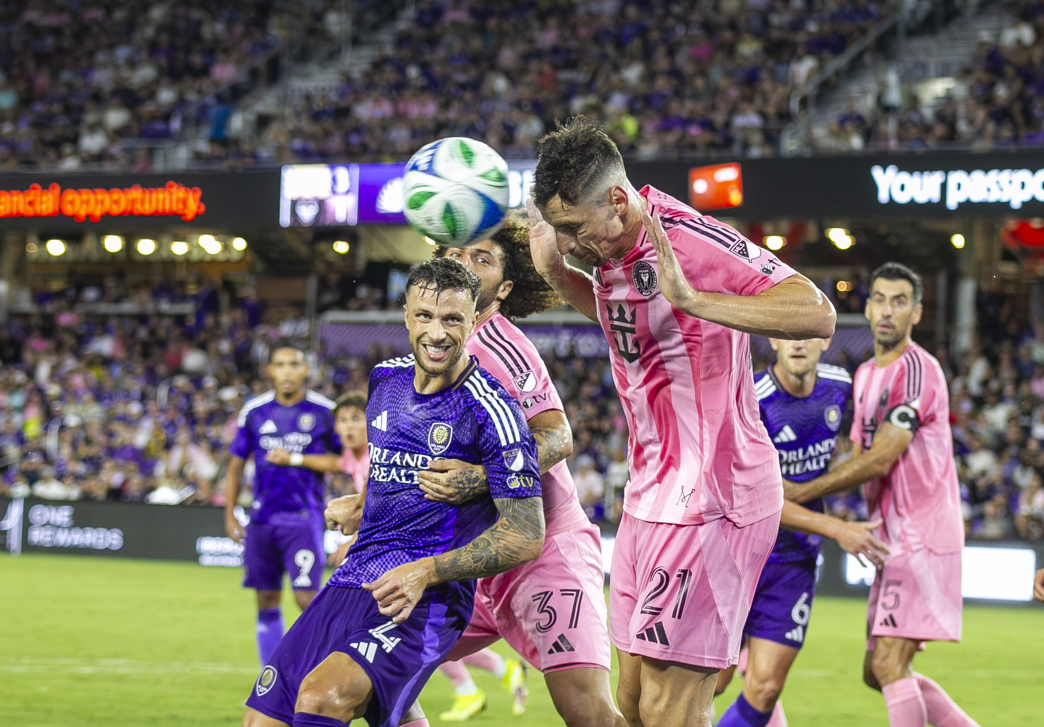 Tadeo Allende, 21, heads the ball during a game at Inter & Co Stadium in Orlando, Fla., on Sunday, August 10, 2025. (Photo by Hanna Maglio)