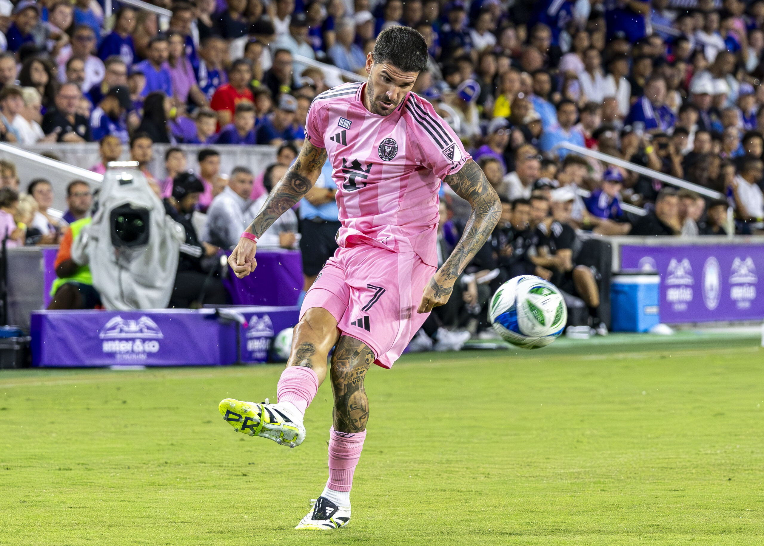 Rodrigo De Paul, 7, kicks the ball during a game at Inter & Co Stadium in Orlando, Fla., on Sunday, August 10, 2025. (Photo by Hanna Maglio)