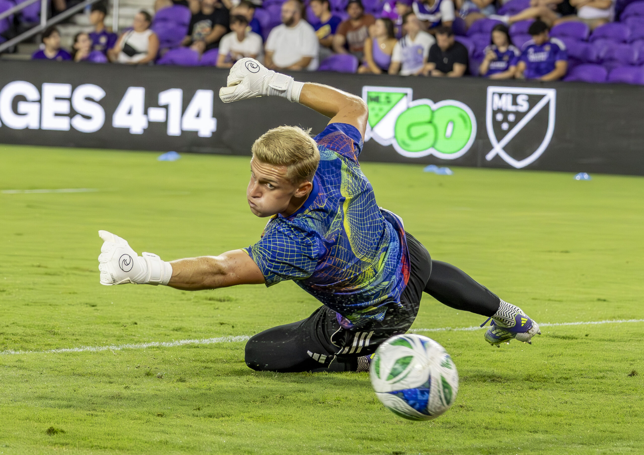 Ryan Schewe misses the ball during a practice before the game at Inter & Co Stadium in Orlando, Fla., on Saturday, August 16, 2025. (Photo by Hanna Maglio)