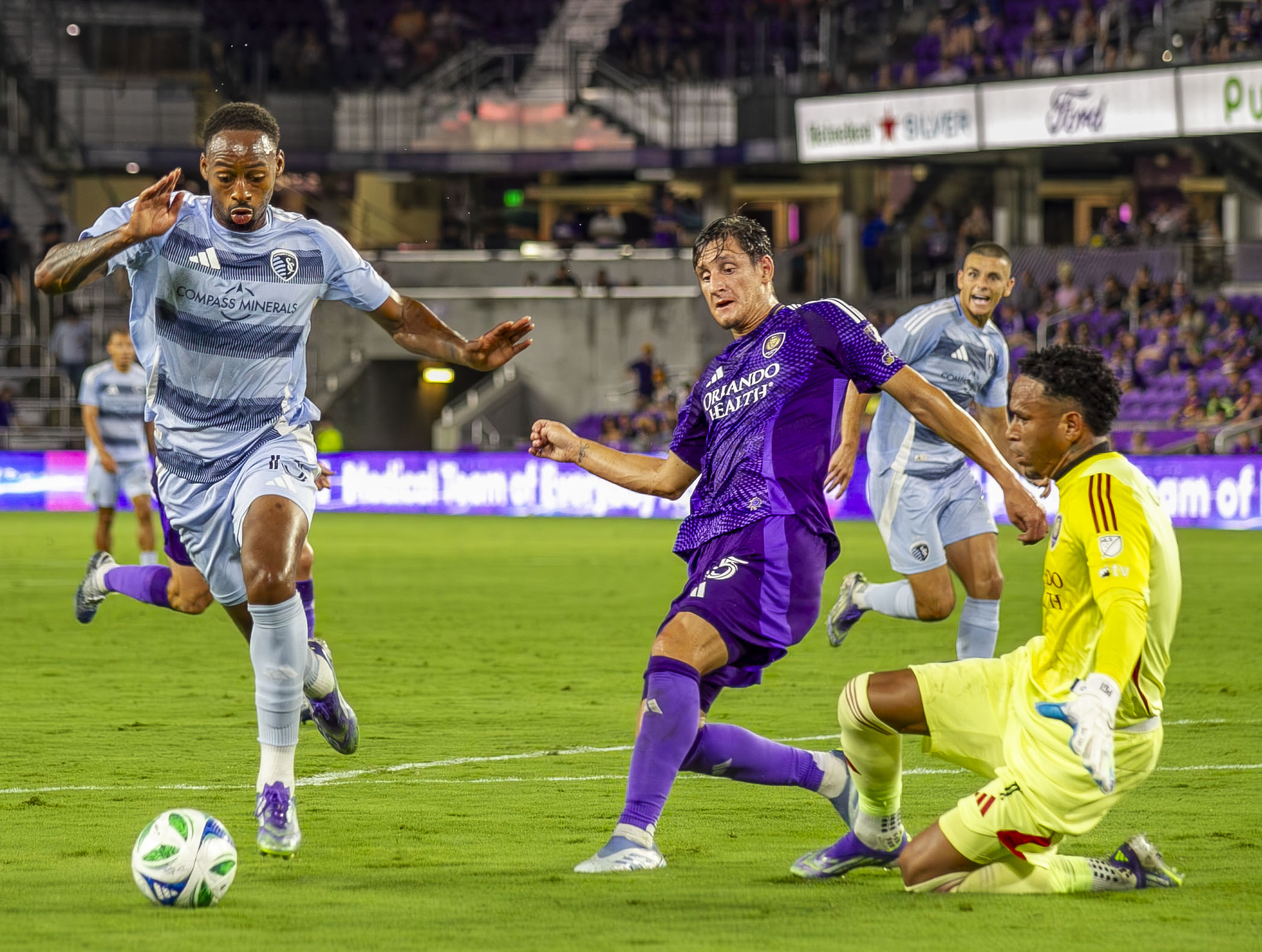Mason Toye, 13, avoids Rodrigo Schlegel, 15, during a game at Inter & Co Stadium in Orlando, Fla., on Saturday, August 16, 2025. (Photo by Hanna Maglio)