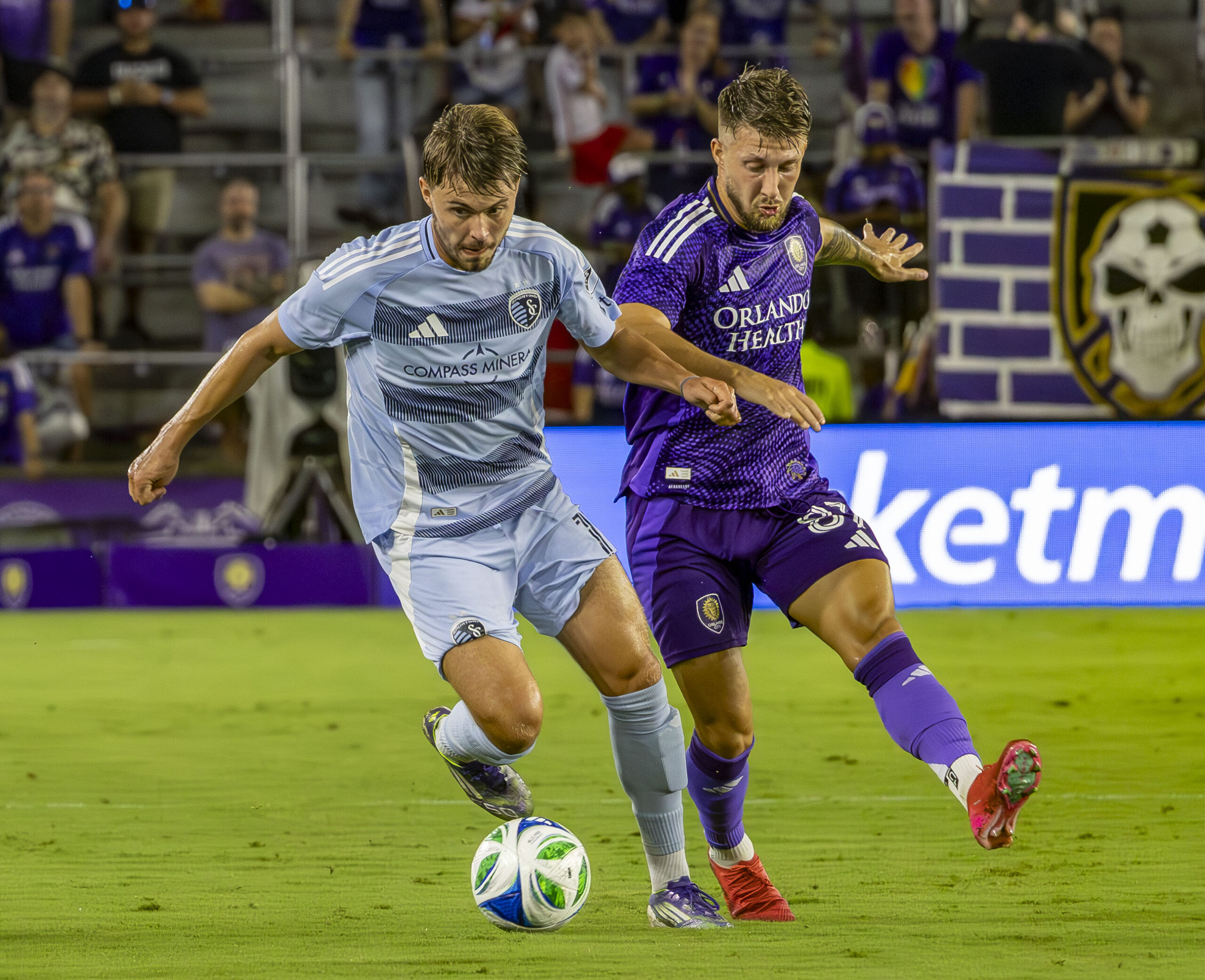 Alex Freeman, 30, (left) and Noah Allen, 32 (right) fight for possession of the ball during a game at Inter & Co Stadium in Orlando, Fla., on Sunday, August 10, 2025. (Photo by Hanna Maglio)